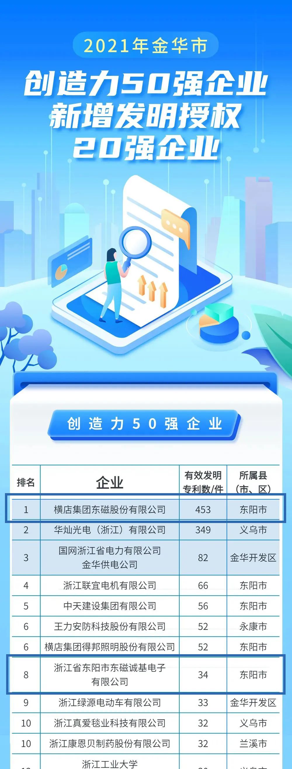 在世界知识产权日之际,浙江省市场监管局及金华市市场监管局,根据有效发明专利数量、高价值发明专利数量和近三年发明专利授权数量等指标,先后发布了省内和金华市内企业创造力排名。横店东磁以其优秀的创新能力,在各类榜单中名列前茅。