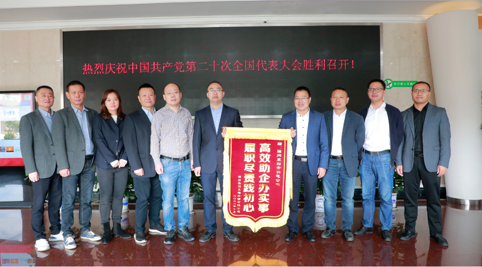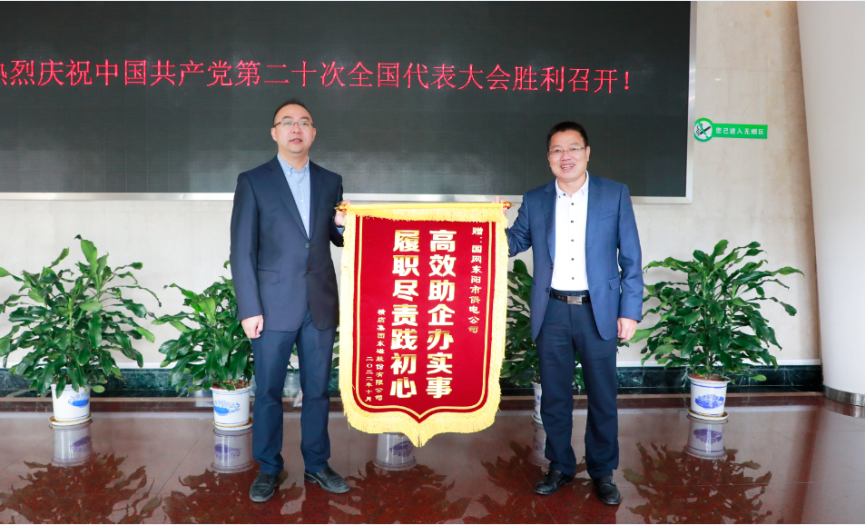 为感谢供电部门在该变电站建设中给予的支持与帮助,10月20日上午,横店东磁副总经理任晓明一行代表公司,将印有 “高效助企办实事 履职尽责践初心”的锦旗交到了国网东阳市供电公司工作人员手里。