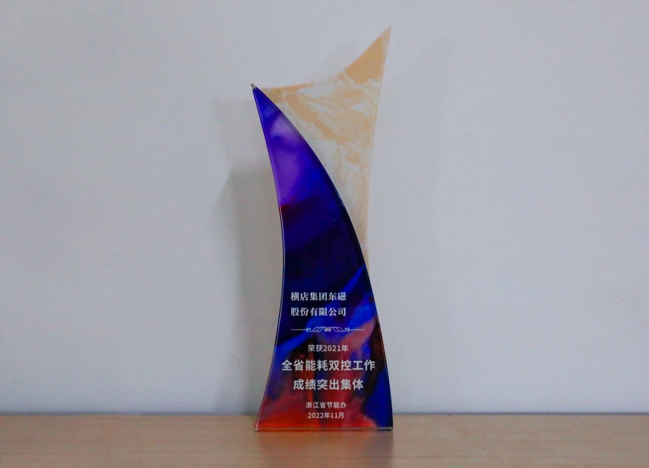 11月25日,2022年浙江省节能新技术新产品新装备展览会在杭州开幕。启动仪式上,省发展改革委党组成员、省能源局局长周卫兵向《浙江省人民政府办公厅关于表扬2021年全省能耗双控工作成绩突出集体和个人的通报》中的10家获奖集体颁发奖杯和证书,横店东磁是其中之一,也是金华市唯一获此荣誉的企业。